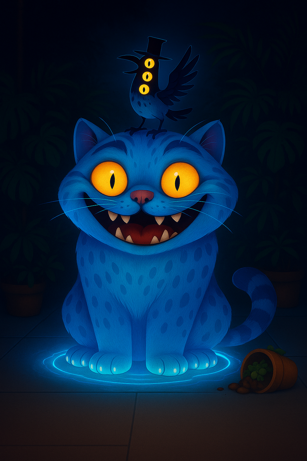 Scene: Derpy the tiger struggling with the flower pot. Magpie Sussy proudly sporting his stolen hat.