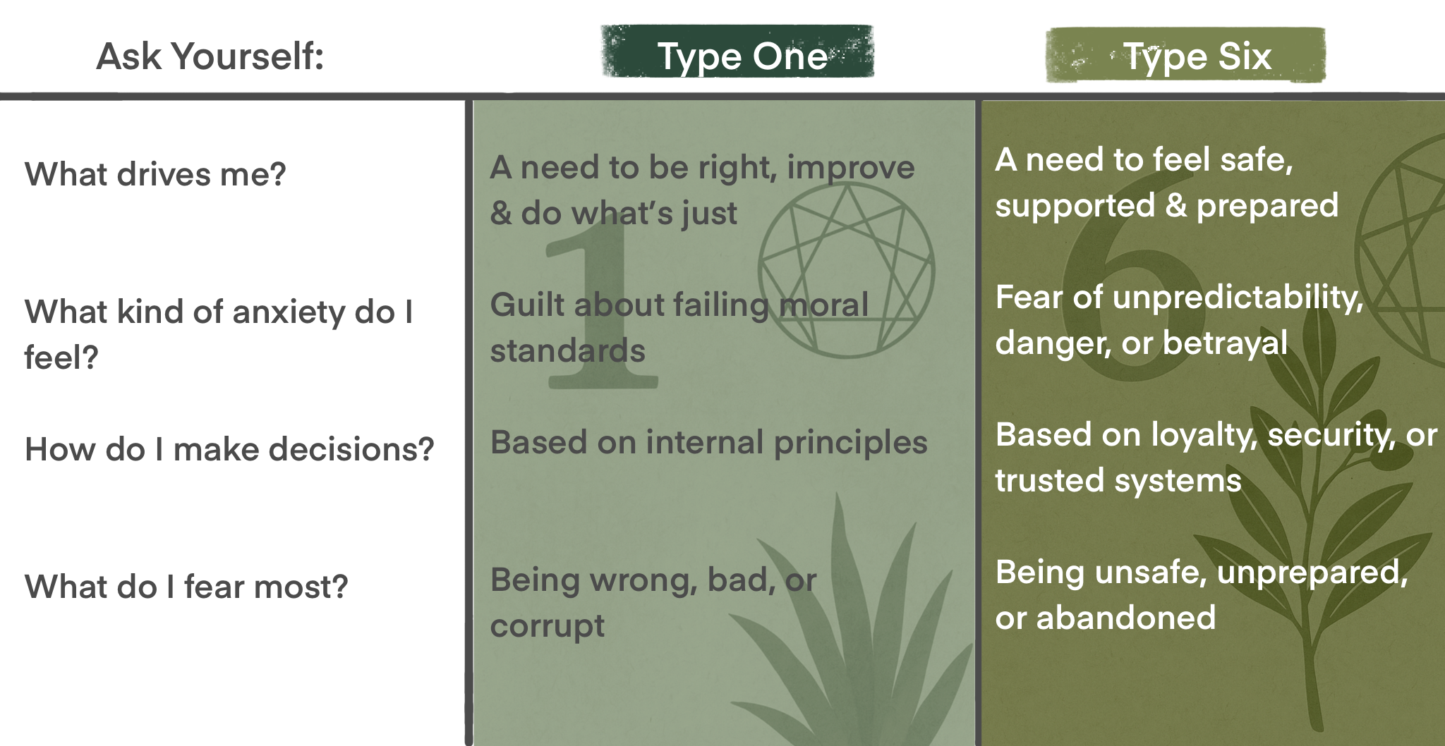 Ones and Sixes can look alike on the surface: responsible, hardworking, rule-following, and often anxious when things feel out of control. They’re both highly principled and tuned in to potential problems, which makes them easy to confuse. But they’re scanning for very different things.