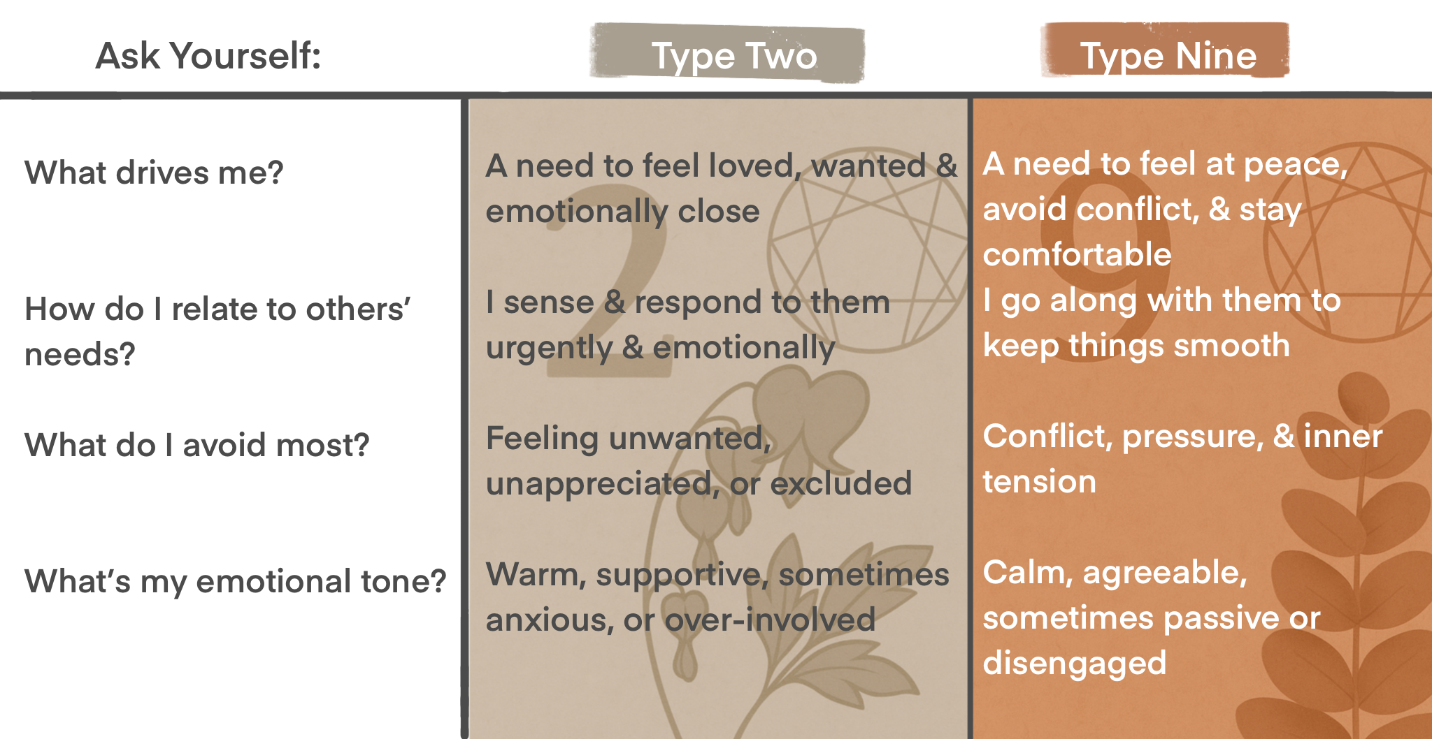Twos and Nines are often confused, especially when a Two has learned to downplay their own needs, or when a Nine shows up as warm, generous, and attentive. Both types are friendly, people-oriented, and often go out of their way to avoid conflict. But the reasons behind that relational ease are very different.