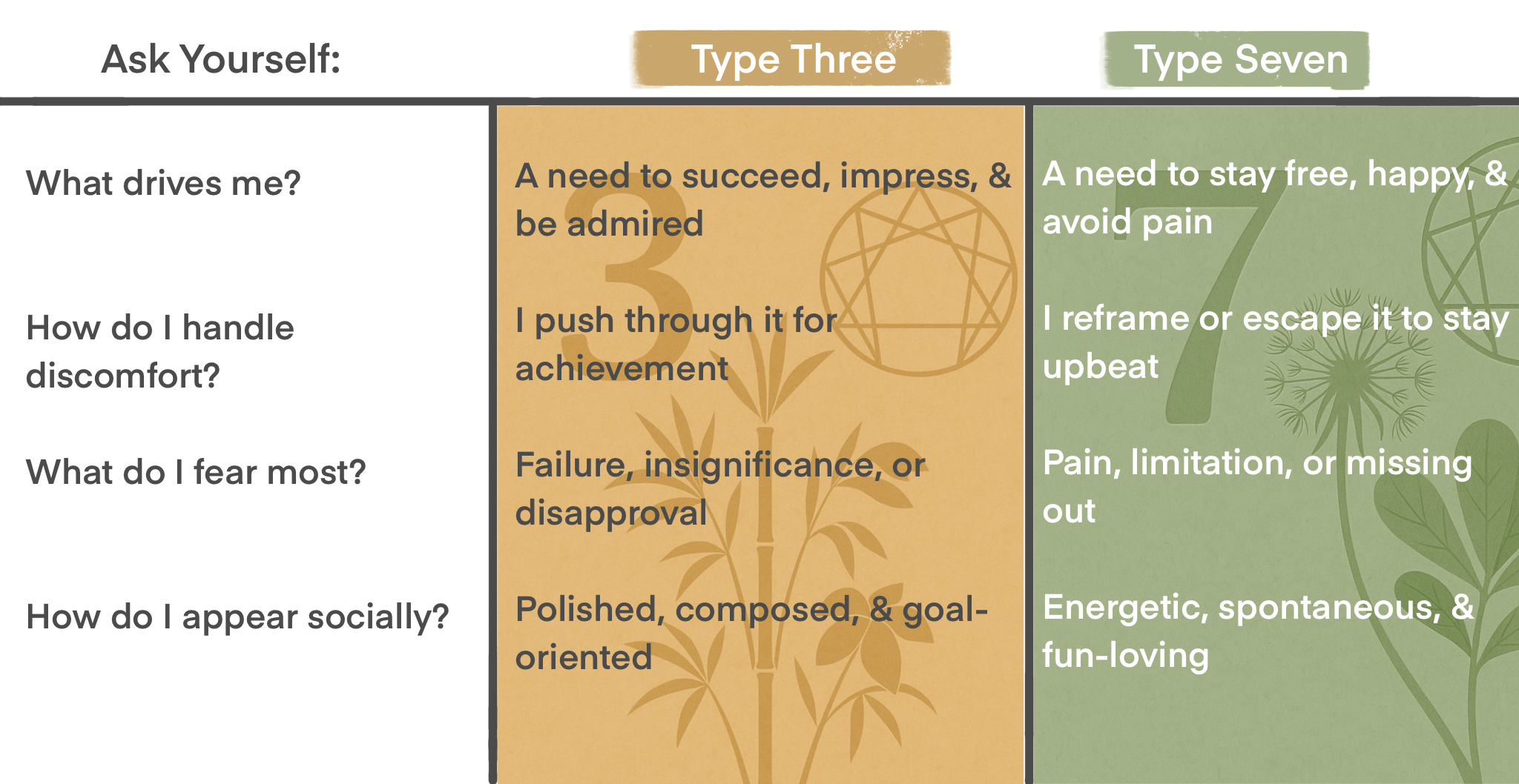 Threes and Sevens can look strikingly similar, especially when they’re both on the go, juggling responsibilities, and chasing big ideas. Both are fast-paced, future-oriented, and great at adapting to situations and people. But their motivation and inner worlds are incredibly different.
