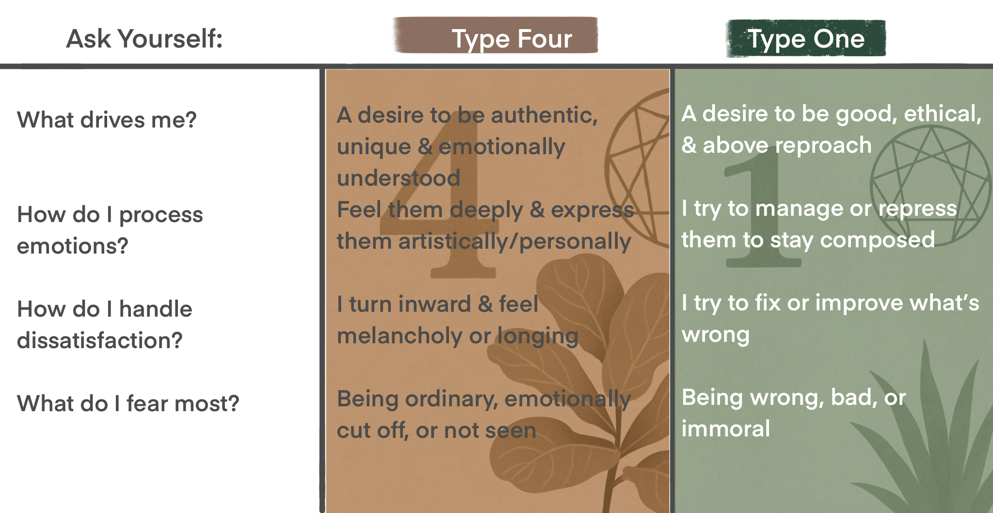 Still, these types can look similar when a One becomes highly self-critical or emotionally suppressed, and when a Four leans into structure or personal responsibility in an attempt to improve.