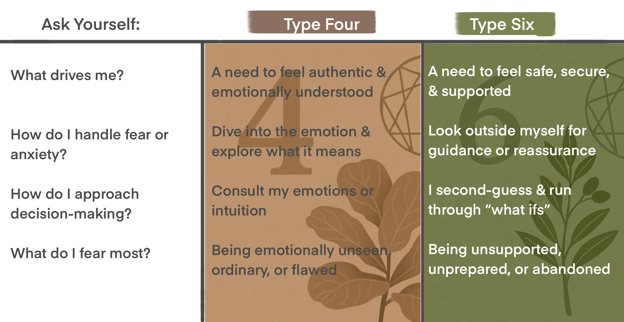 Type Fours and Type Sixes can both be emotionally reactive, introspective, and prone to self-doubt, which is why they’re often confused with one another. But their emotional worlds operate in very different ways.