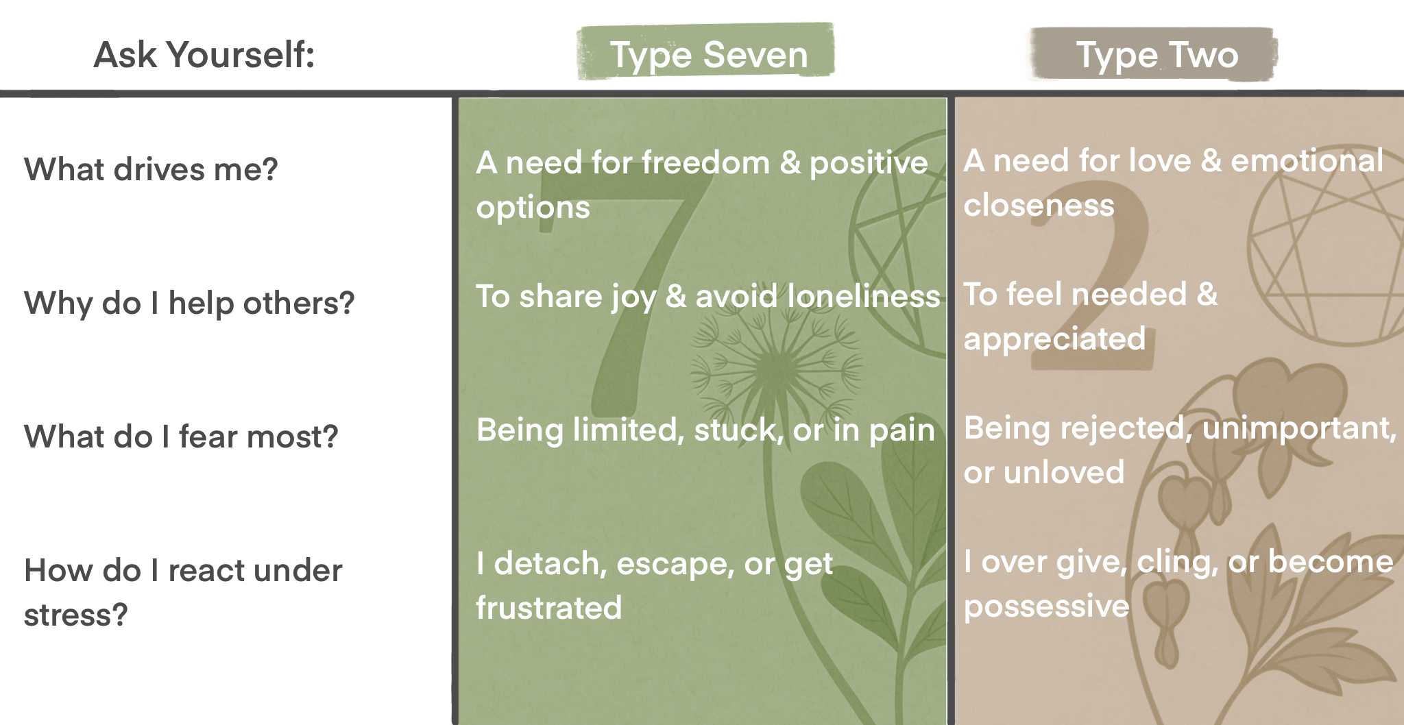 Twos want to be essential to others; Sevens want to enjoy others without feeling tied down