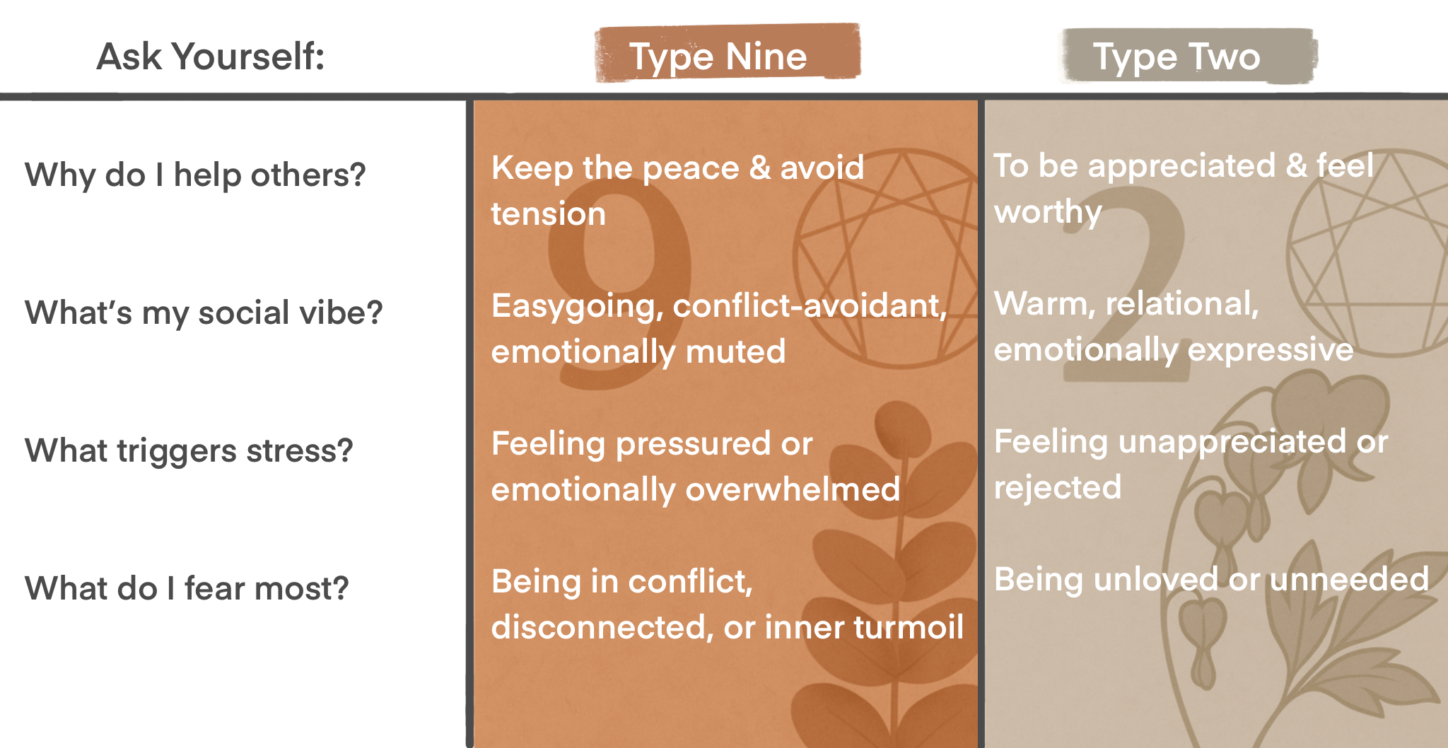 You might think you’re a Nine if you’re a Two who’s tired, suppressing your own needs, or has learned that harmony is safer than emotional honesty.