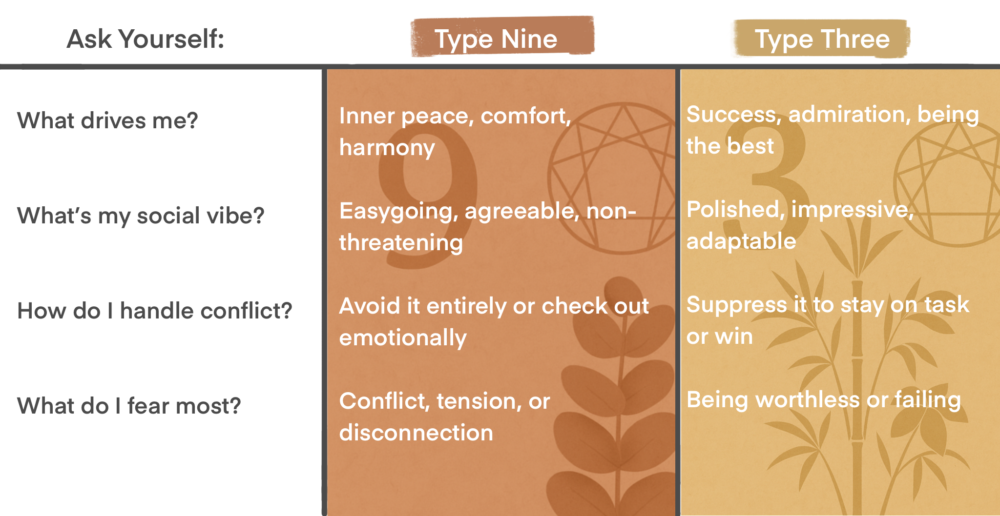 Both types often suppress their own needs, but Nines do it to avoid disruption, while Threes do it to stay admired.