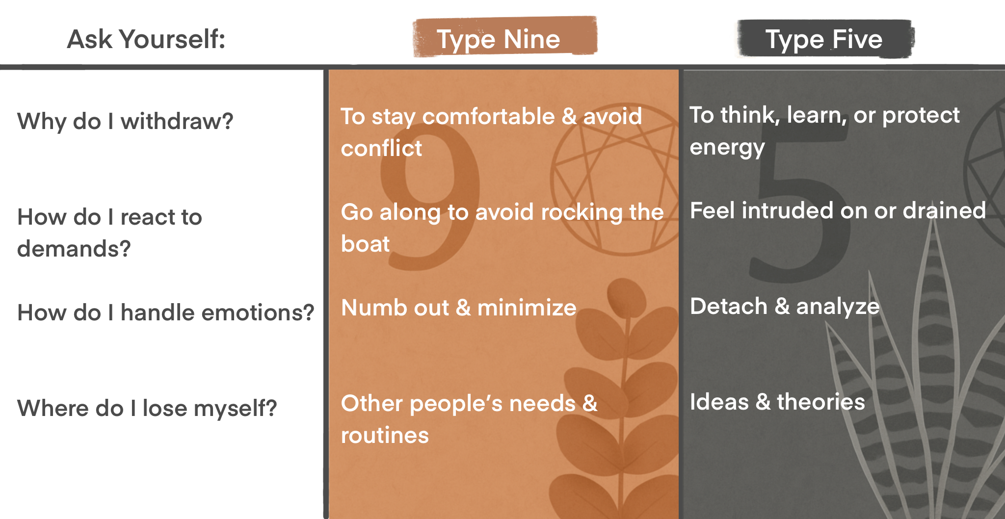 Both types may say, “I just want to be left alone”, but Fives mean it to protect their energy, while Nines mean it to preserve their peace.
